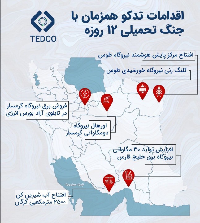 تدکو در عین حال با تدبیر و مدیریت بهینه موفق شد تولید برق نیروگاه خلیج فارس خود را 30 مگاوات افزایش دهد. مسعود دیرباز، مدیرعامل شرکت تولید نیروی برق خلیج فارس، از گازسوز شدن کامل این نیروگاه در بحبوحه جنگ خبر داد: «با حذف گازوئیل، هم استهلاک کاهش یافت و هم 30 مگاوات به ظرفیت تولید افزوده شد. این دستاوردی تاریخی برای پایداری شبکه بود.»تدکو با محوریت سه استراتژی کلان توسعه انرژیهای تجدیدپذیر همچون نیروگاه خورشیدی طوس و بهینهسازی زیرساختهای حیاتی چون آب شیرینکن کرگان و افزایش تابآوری شبکه برق (نیروگاههای گرمسار و خلیج فارس) در جهت امنیت انرژی و آب کشور گام برداشته است.