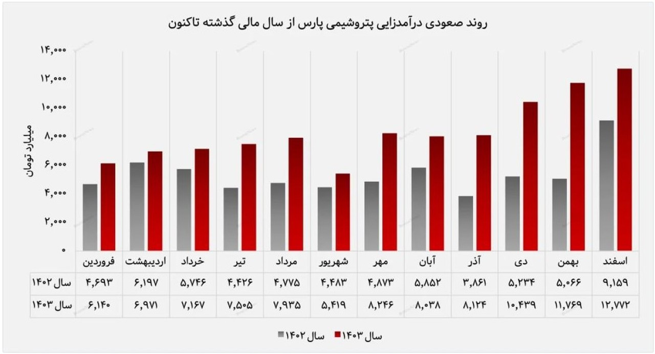 به گزارش پتروپیام: پتروشیمی پارس در تازهترین گزارش عملکرد خود برای اسفندماه 1403، اعلام کرد که درآمد این شرکت در این ماه به 12 هزار و 772 میلیارد تومان رسیده است. این رقم نشاندهنده رشد 60 درصدی نسبت به میانگین درآمد 11 ماه گذشته و افزایش 39 درصدی نسبت به مدت مشابه سال قبل میباشد.